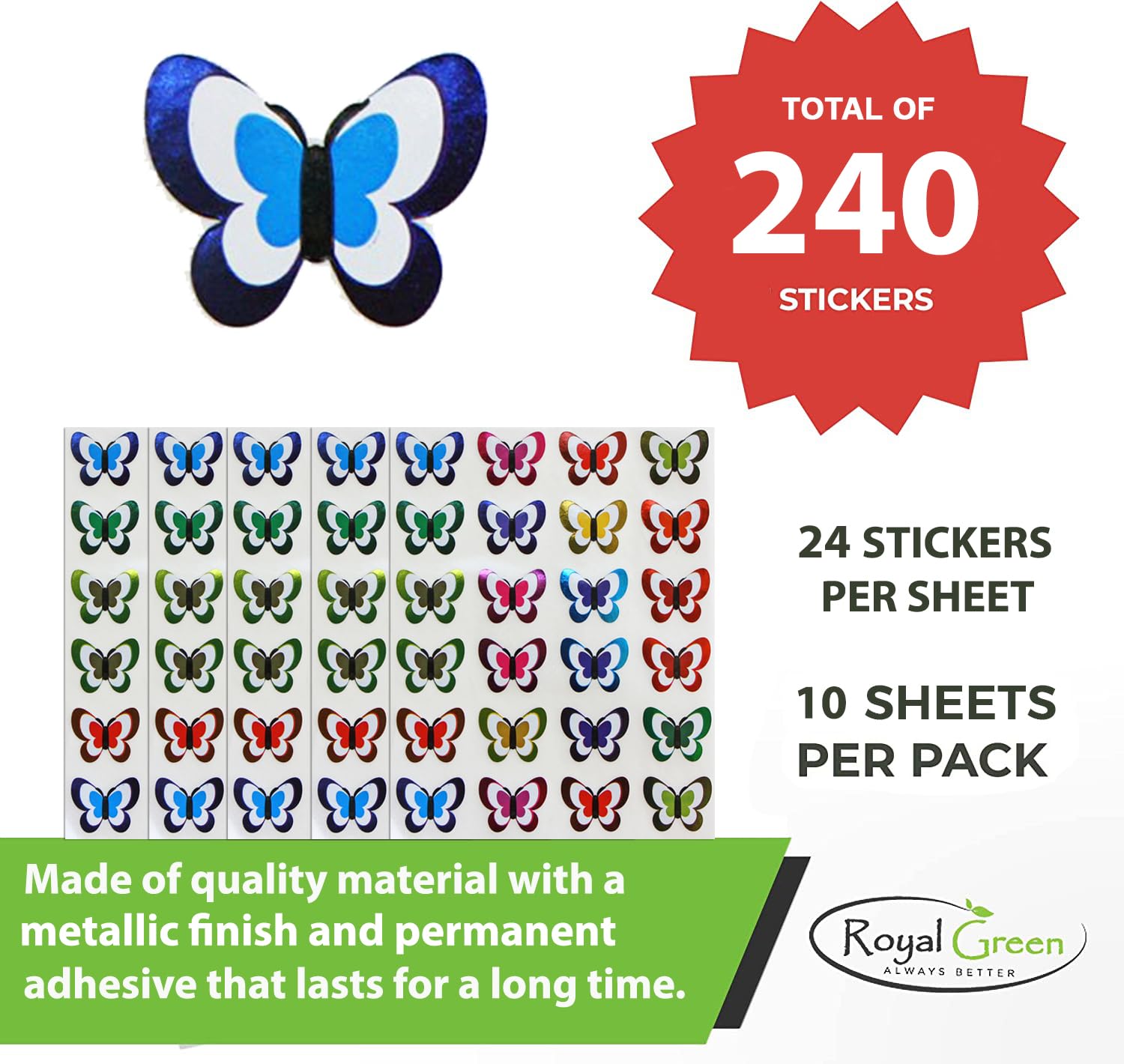 Butterfly Stickers in Metallic Colors - 240 Pack, Butterflies Decorative Craft Sticker Sheets for Scrapbooking Arts and Crafts by Royal Green